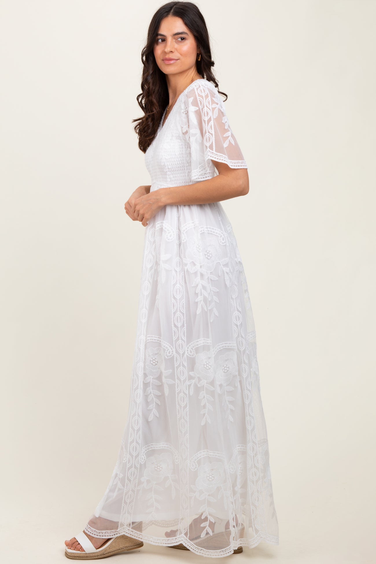 Elevate your style with our White Smocked Top Lace Maxi Dress, a perfect blend of elegance and comfort. Featuring a delicate smocked bodice that hugs you gently, this dress showcases sheer flutter sleeves and a flattering V-neckline. The soft lace overlay flows into a graceful maxi-length skirt with intricate floral embroidery, creating a romantic and airy look. Ideal for summer events, garden parties, or beach weddings, this dress pairs beautifully with sandals or heels. Made from lightweight, breathable fabric, it offers all-day ease with timeless charm. Embrace effortless femininity with this must-have maxi dress!