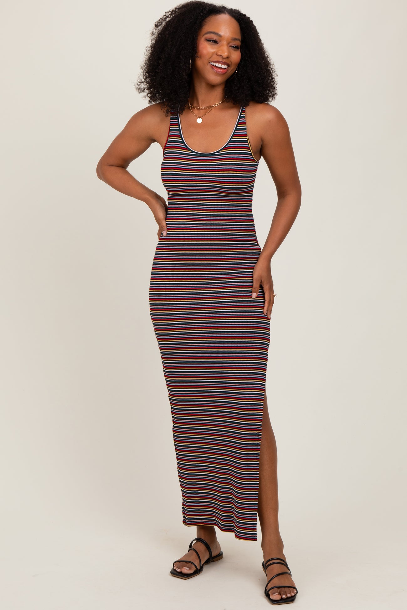 Yellow Multicolor Striped Side Slit Maternity Maxi Dress